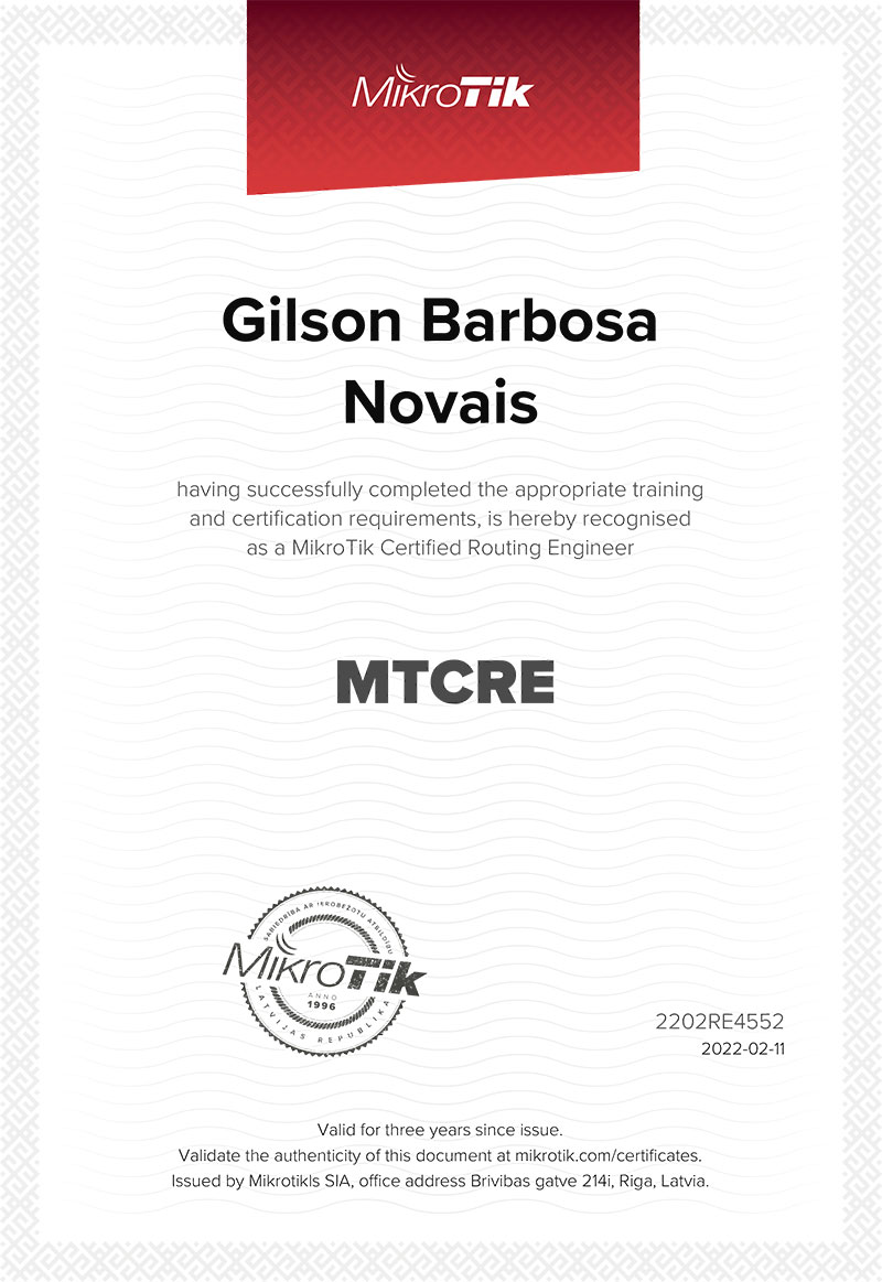 Certificação Mikrotik Engenheiro Roteamento MTCRE que fiz presencialmento em São Paulo em 2022 (expirada).